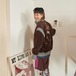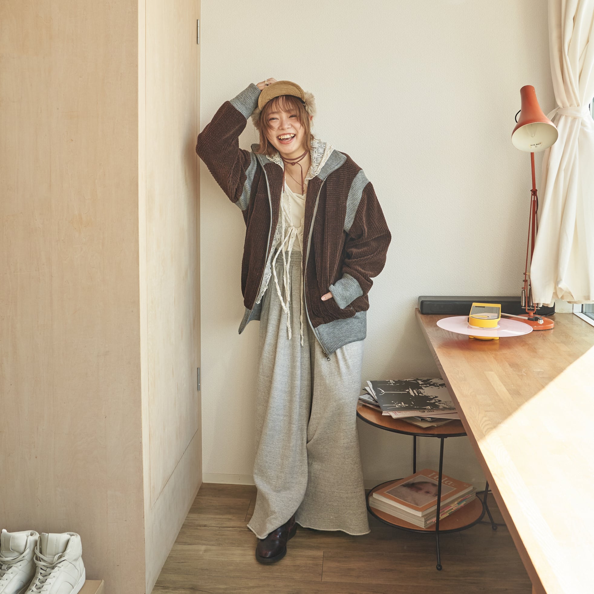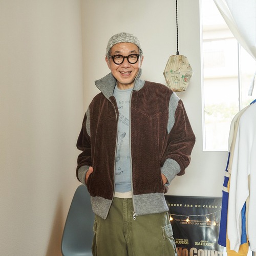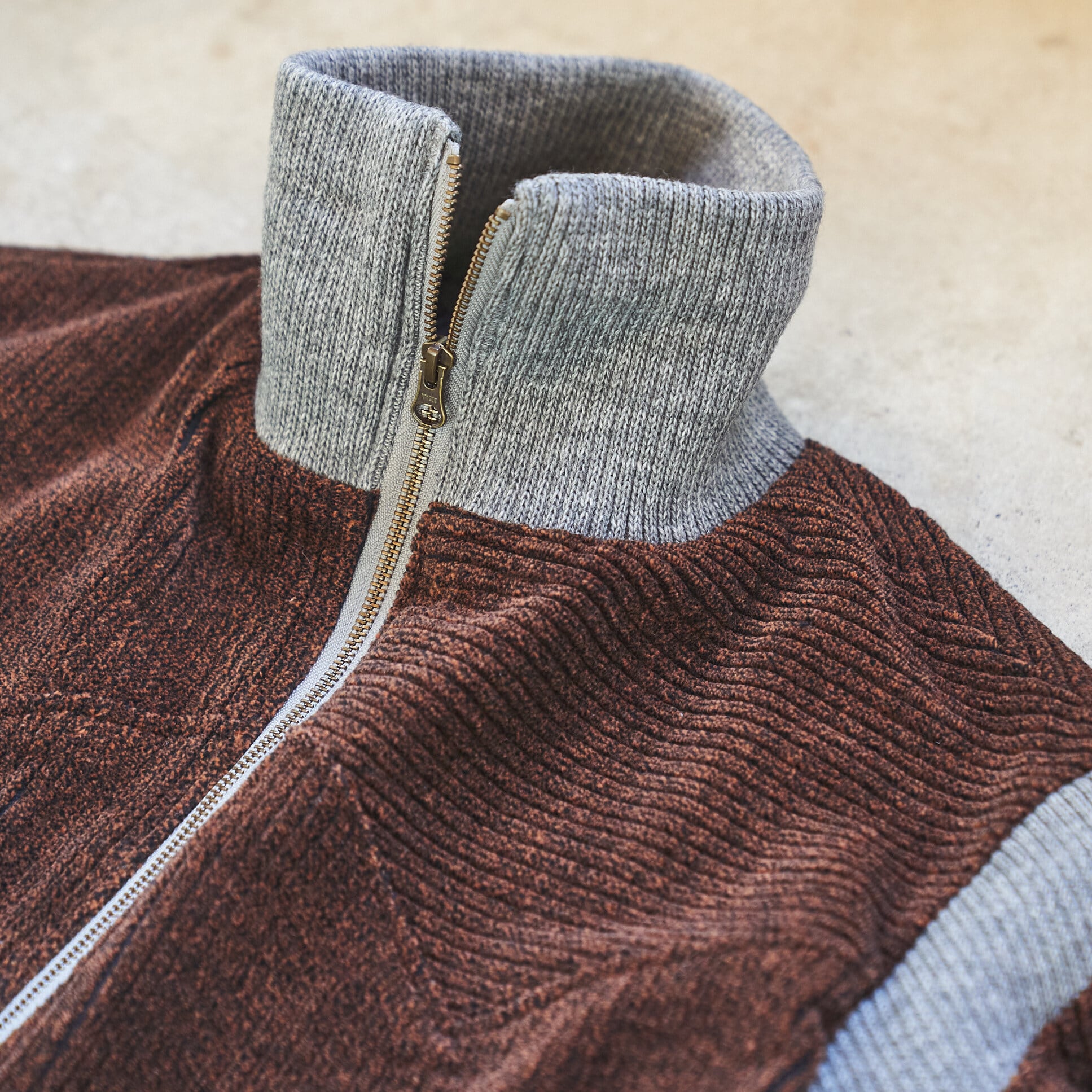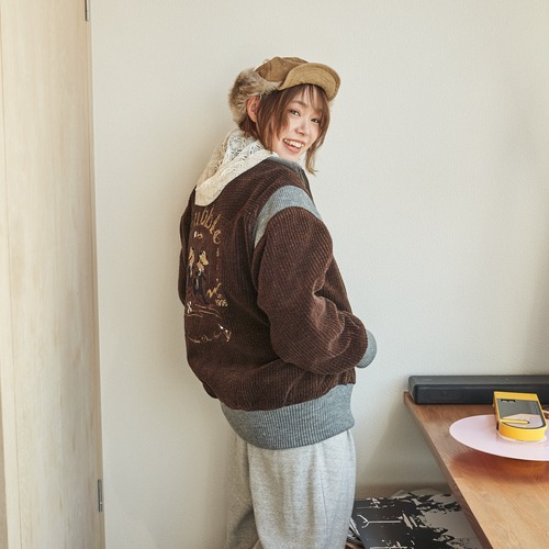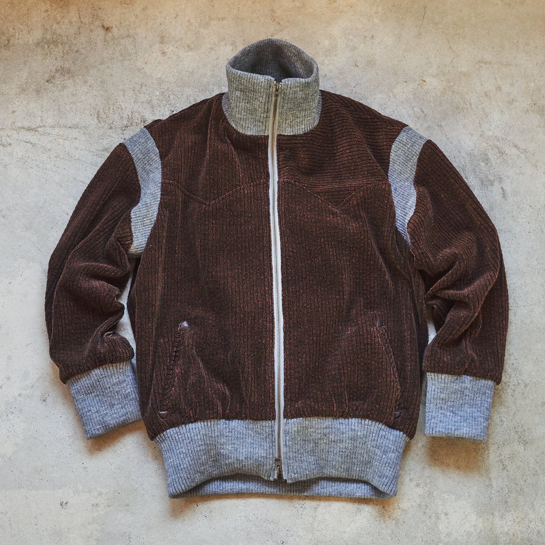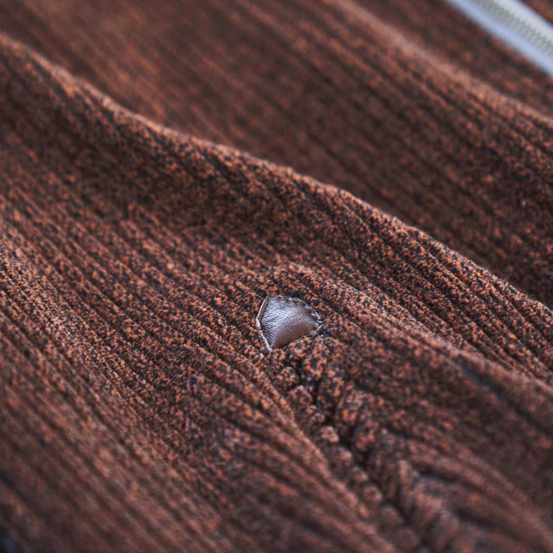 ブラウンとブラック、2色の先染め糸を使ったメランジ風太畝コーデュロイジャケット。