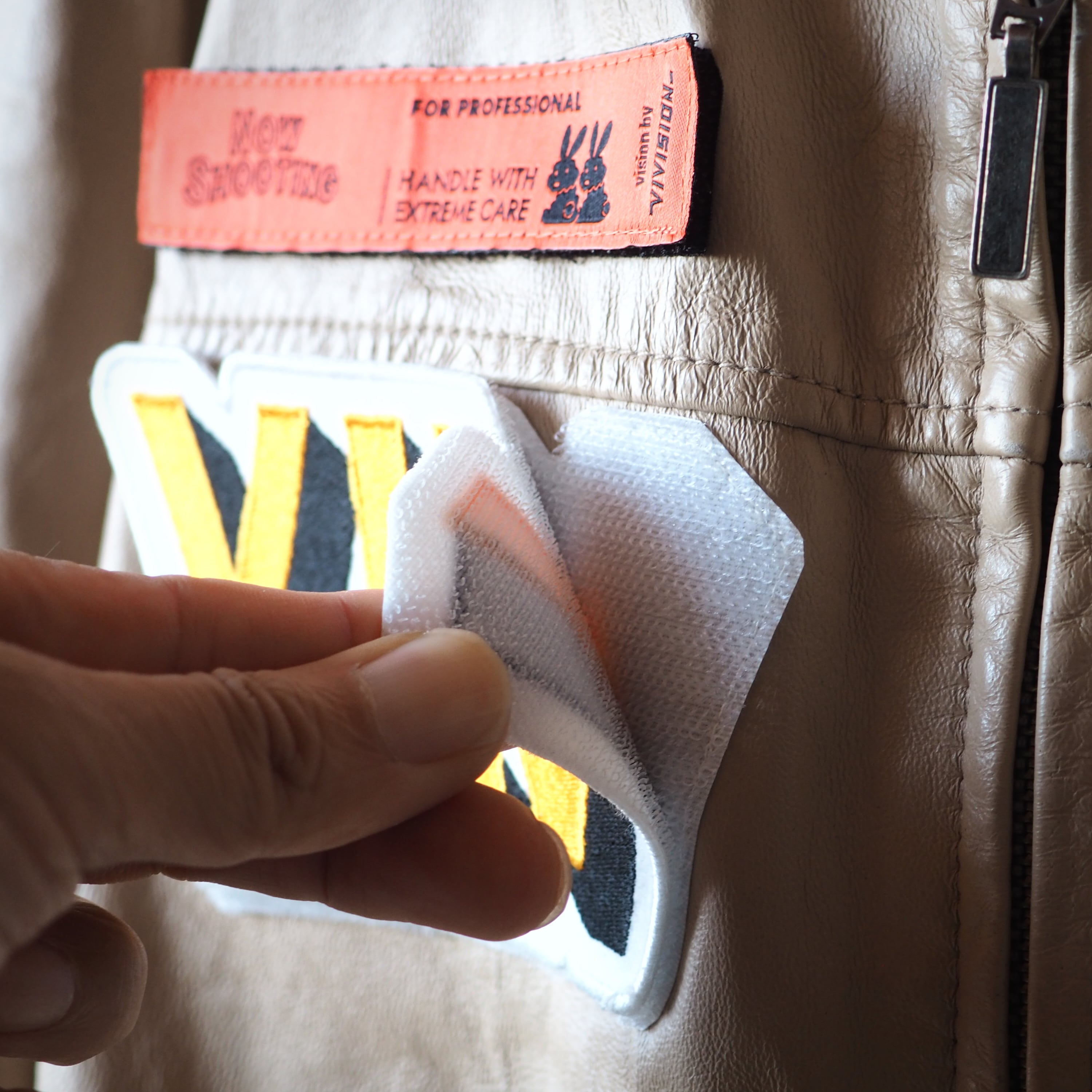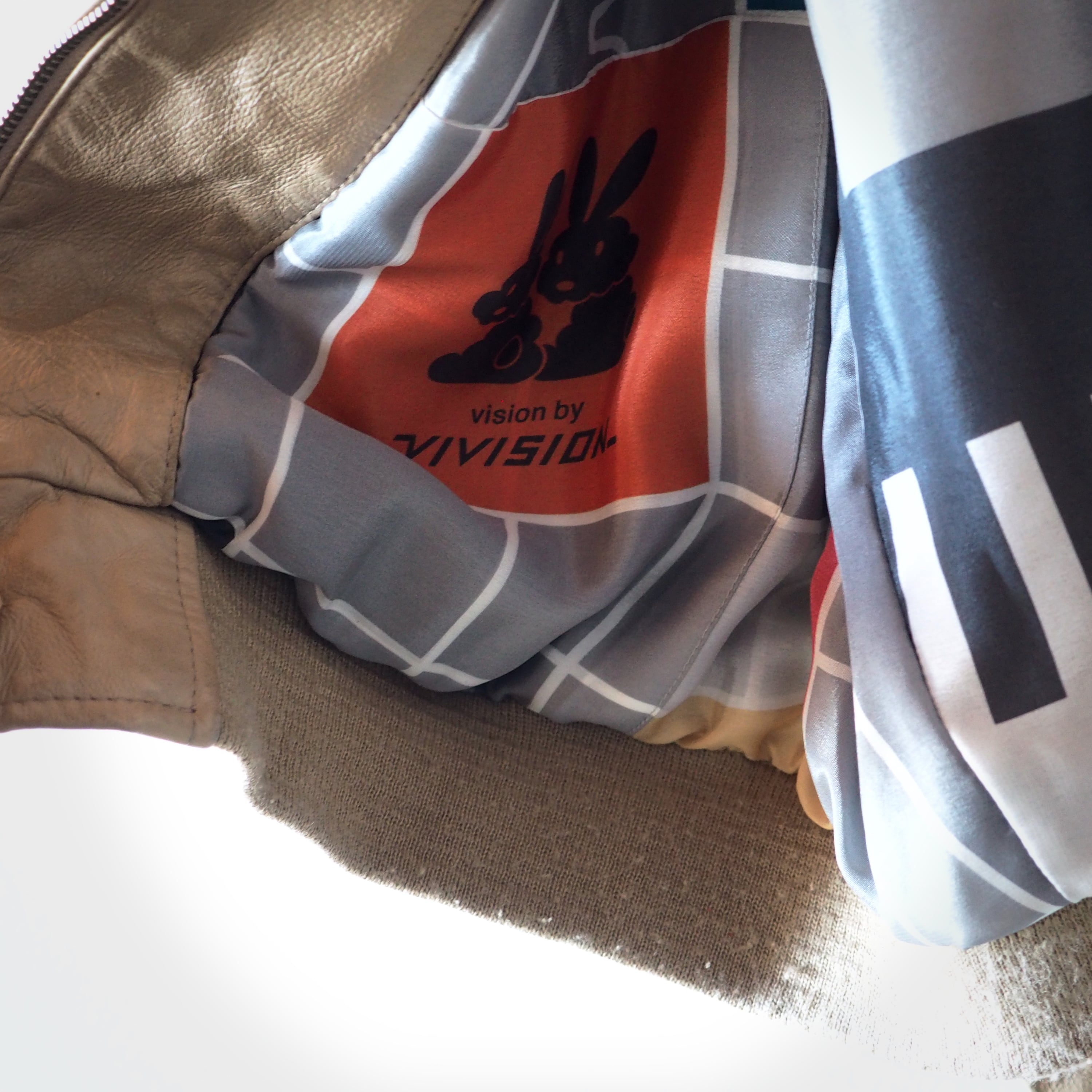 BUBBLEの菊地が選んだ古着のアイテムにvivisionの児玉氏がレーザーで彫刻し、BUBBLEとvivision両ブランドのワッペンを縫い付けてあります。さらに裏地にはvivisionオリジナルのシルクスカーフを贅沢に使用いたしました。