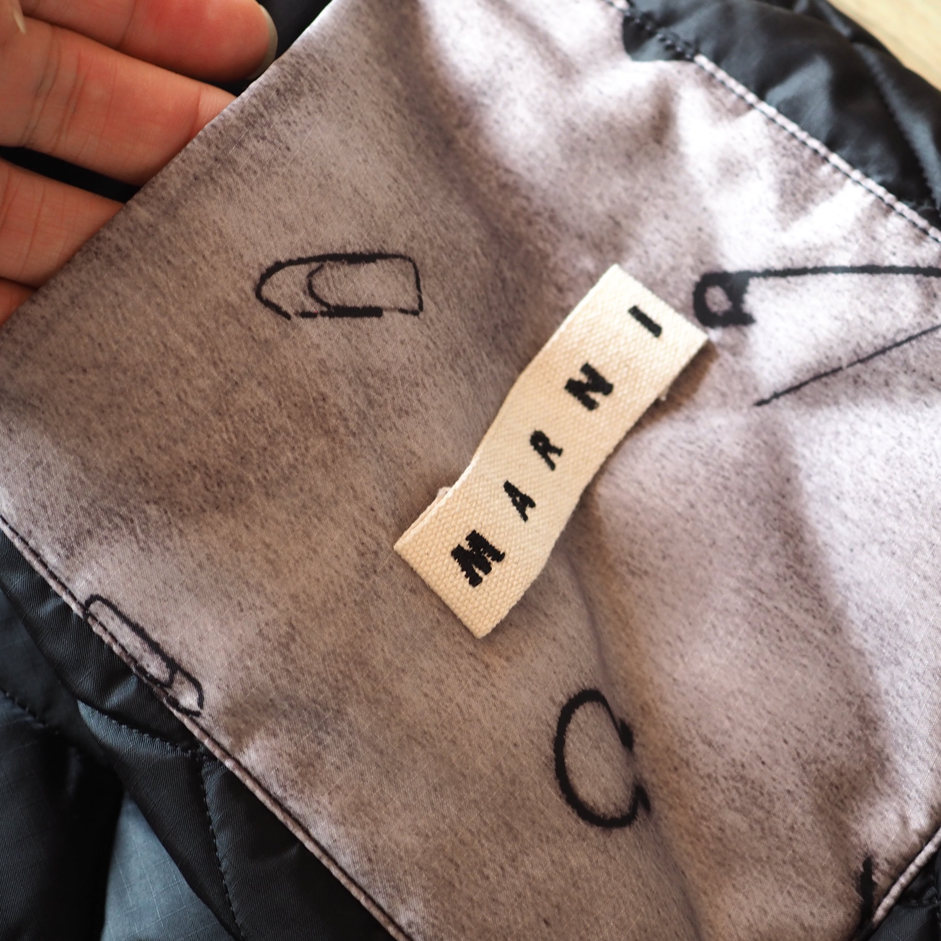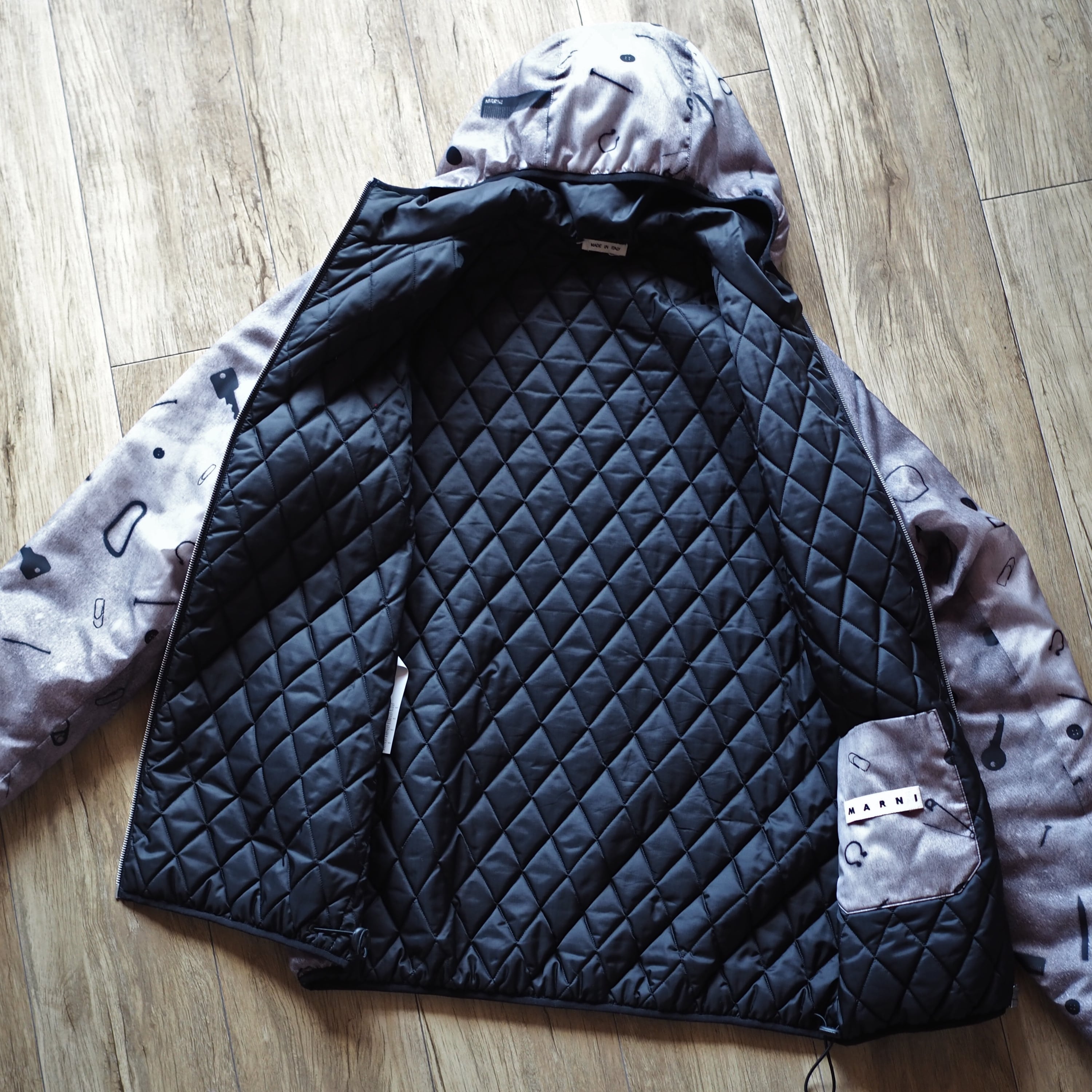 軽量なナイロン生地を使用したマルニらしいグラフィックデザインの中綿入りジャケット。全体的に軽い使用感がありますがまだまだご着用いただけると思います。中古品であることをご理解の上ご購入ください。